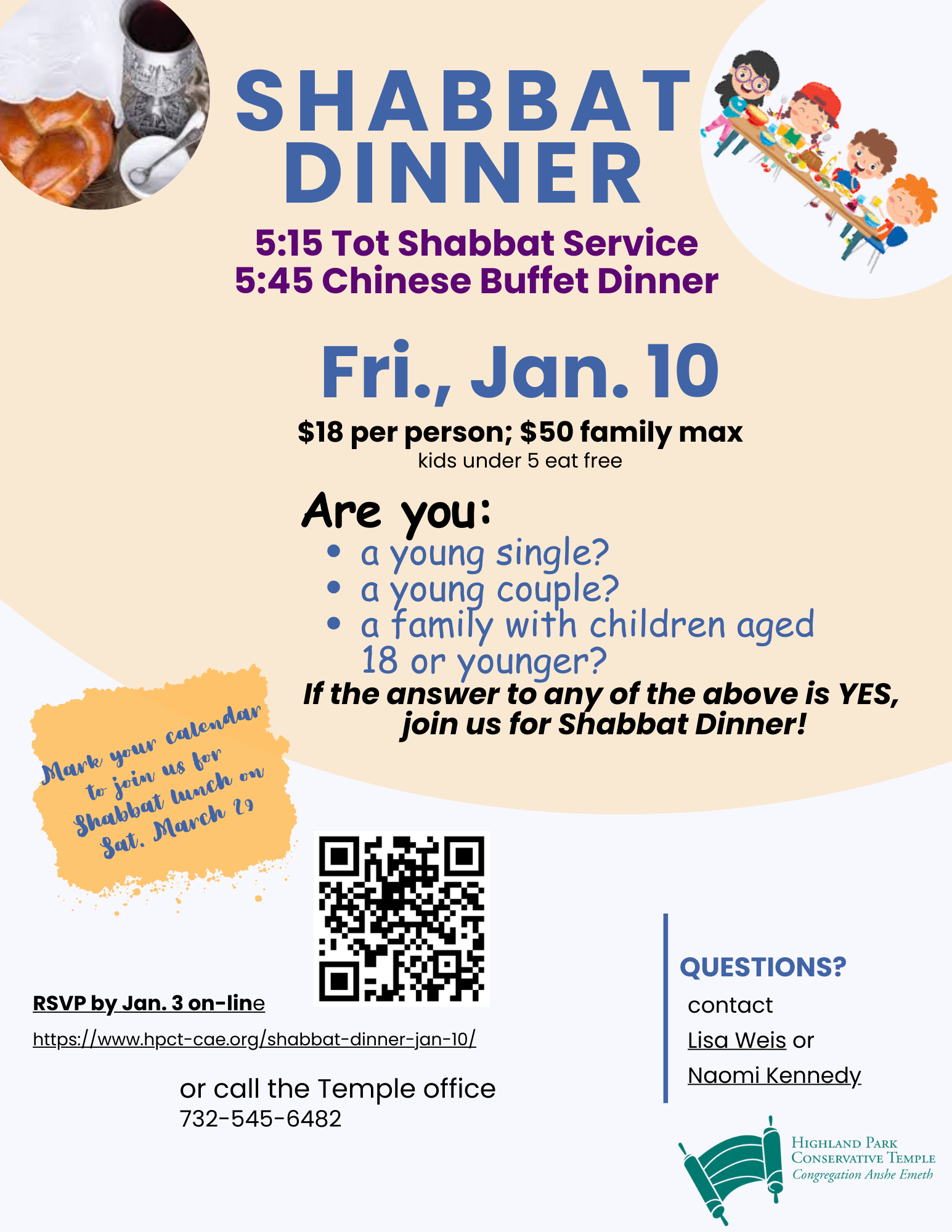 You are welcome to stay and enjoy Shabbat dinner! ($18 per person; children under 5 eat free; $50 family max)